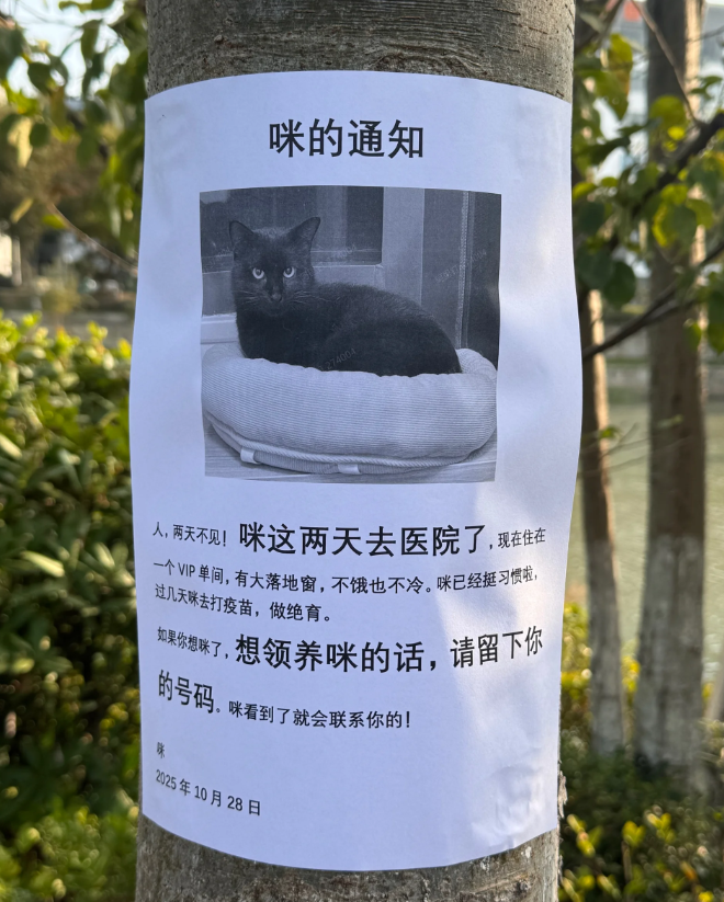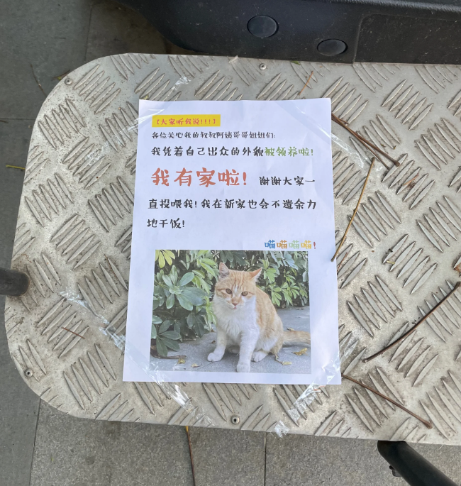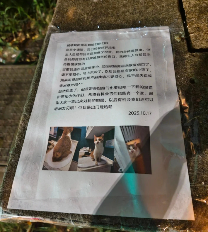 小红书网友@诺诺以前经常看到这只流浪猫,后来发现猫咪消失了,再看看猫咪以前经常待的地方出现了一张字条。